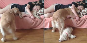 The cat tries the usual swatting, but the puppies don’t quite get the message.