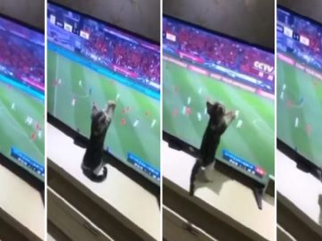 Cat watches football on TV and tries to catch the ball A kitten watching Asian Cup 2019 tried to catch the football on a TV...