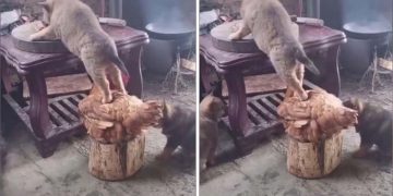 The dog is seen appearing at the entrance of the shop and grabbing the cat’s collar with its teeth, dragging the cat inside the shop.