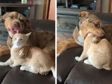 An adorable video of a dog stroking a cat before the pair seemingly hug is melting animal lovers’ hearts. Jordan Ireland captured the sweet moment...