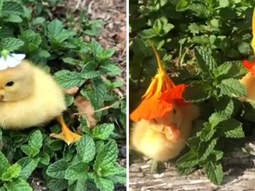 Duckling Falls Asleep With Flower On Head The video begins with a duckling sitting in a patch of green as a hand appears in the...