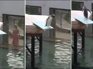 Hilarious Video Of A Nervous Penguin Afraid To Jump Off The Diving Board.