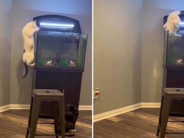 In the vid, her cat named Momo decides to spring up onto a fish tank. But the critter has made an unfortunate mistake, as it...