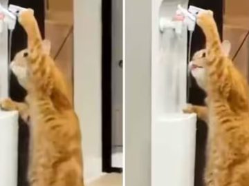 Cat Drinking Water From A Water Cooler. The video shows a cat standing on its hind legs in front of a water cooler. Pressing the...