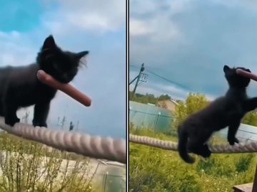 Kitten tightrope walker A kitten can even cross a tightrope! The small feline protected the snack in its mouth — food was its priority! There...