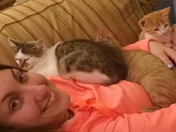 Three orphaned kittens from different litters found a new mom who rescued them when they needed a home. Now kittens will jump up on her...