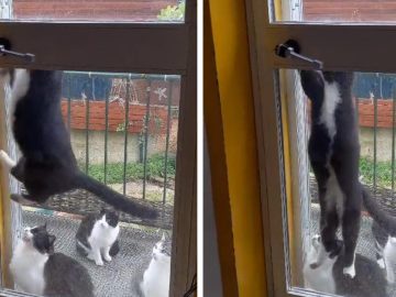 Cat Swings on Handle to Open Door This kitty jumped into action to let all his cat companions in. Footage shows the black and white...