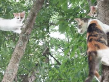A kitten got into a tight spot when it climbed a tree but did not know how to come down. Its mother tried her best...