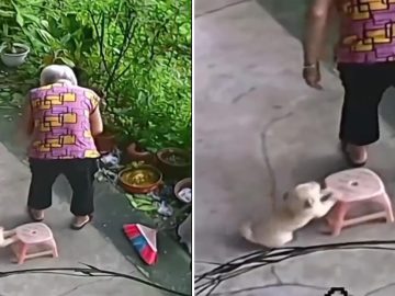 Tiny puppy pushes a stool so grandma can sit The video opens to show the grandma, watering some plants and then wanting to sit down....