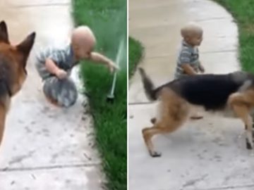 Toddler adorably helps German shepherd get over his fear of the sprinkler The dog felt that the water sprinkler in the garden was too dangerous...