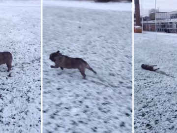 French bulldog is slip slidin’ away in the snow Watch this French Bulldog get a running start and dive head first into the snow. In...