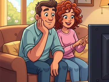 A husband and wife are sitting on the couch watching TV. The wife looks at the husband and he is staring at the ceiling above...