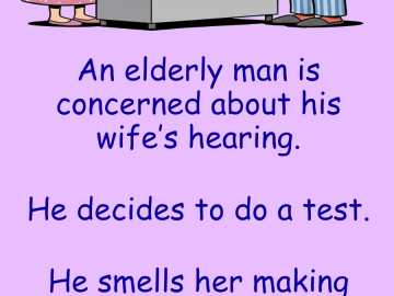 An elderly man is concerned about his wife’s hearing. He decides to do a test. He smells her making dinner, so he stands in the...