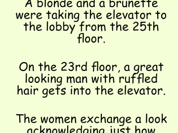 A blonde and a brunette were taking the elevator to the lobby from the 25th floor. On the 23rd floor, a great looking man with...