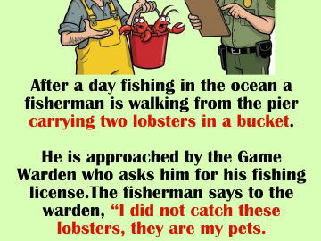 After a day fishing in the ocean a fisherman is walking from the pier carrying two lobsters in a bucket. He is approached by the...