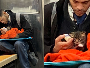Heart Warming Moment: Man Cares for Tiny Kitten Adorably On Subway.