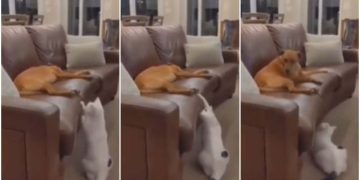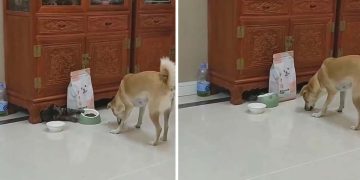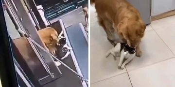 The cat also seems to love meeting this loving and gentle creature but she doesn’t seem to be into the ‘love at first kiss’ thing and faces the other way, breaking the poor guy’s heart.