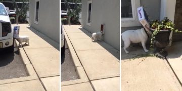 This bulldog with a box on its head bumping Into EVERYTHING.