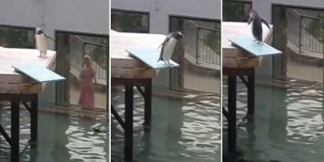Hilarious Video Of A Nervous Penguin Afraid To Jump Off The Diving Board.