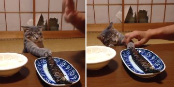 Very Persistent Cat Can’t Stop Touching The Grilled Fish.