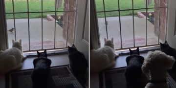 Cats watching bird, dog scares cats. Prepare to laugh uncontrollably.