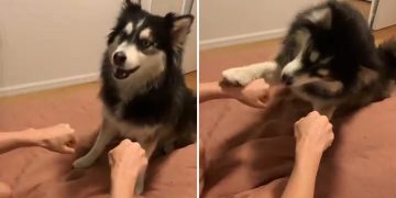 Adorable pomsky dog gets totally puzzled by prank with treats. Too cute to handle.