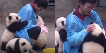 Adorable moment: giant panda cuddle with keeper during shower time.