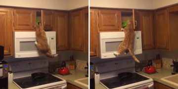Cat Burglar Caught Trying to Steal Snacks From a Closed Kitchen Cupboard.
