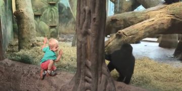 Little Boy and Baby Gorilla Playing Adorable Game of Peek-A-Boo