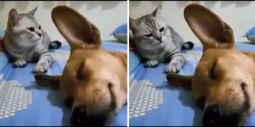Hilarious moment when cat hits dog on the head for letting out a huge fart