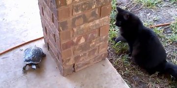Adorable moment cat and turtle playing tag together