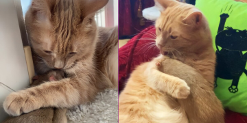This father cat is struggling to feed his kitten and it is so cute