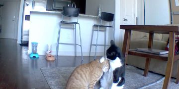 Camera captures a cat comforting his worried brother while mom is away.