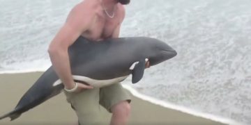 Kayaker spots baby dolphin on beach – his daring rescue is captured on video
