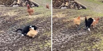 Cat’s hilarious attempt to scare dog ends up startling itself.