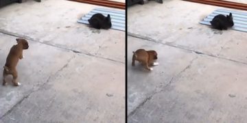 Adorable puppy hopped and jumped imitating his bunny friend.