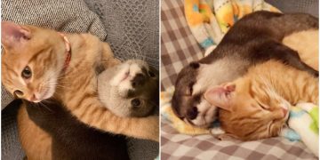 Every Night Before Bed, Cuddly Otter Hugs Her Kitten Best Friend