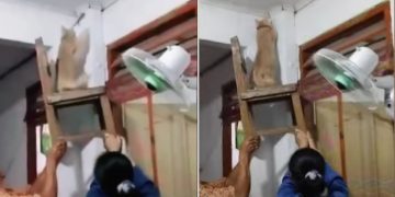 Indonesian family puts their beloved cat on a chair to catch gecko.