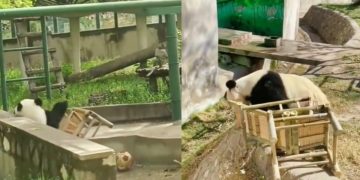 Funny moment: a panda gets angry and pushes a chair down as revenge.