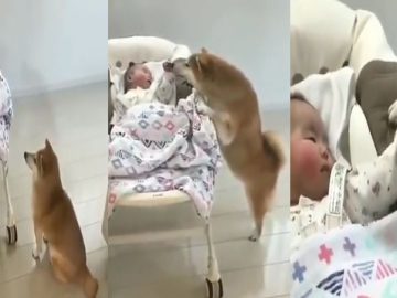 Dog goes up to the baby in the crib when it starts crying. After rocking the crib, the baby calms down. Newborn babies are demanding....